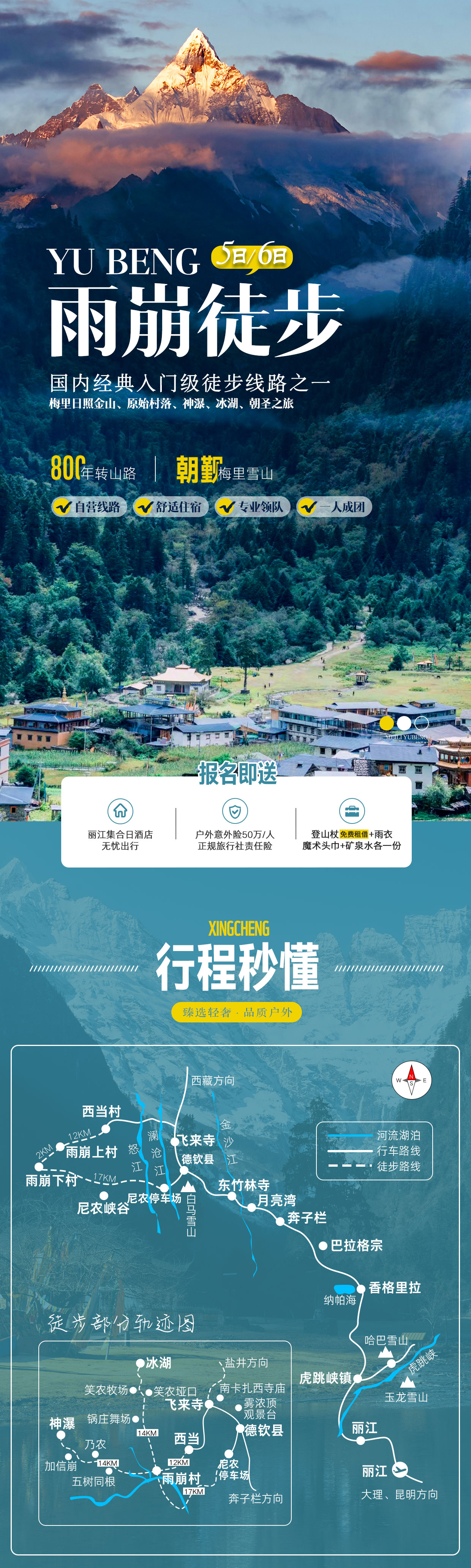 住宿:全程5晚标间住宿(雨崩3晚、飞来寺); 交通:行程中旅行用车,一人一正坐(人少可能和其他雨崩行程的拼车); 门票:雨崩村门票; 向导:全程专职专线向导带队服务,并提供基础拍照服务;节假日可能会多 保险:代办旅游组合险赔付50万元/人,因道路交通事故造成的客人意外伤害,按《道路交通事故处理方法》由保险公司赔偿,俱乐部不承担另外的赔偿责任。 / 费用不含 大交通:各地到丽江往返大交通; 餐饮:其他全程用餐自理,驴友可一起AA,向导会根据需求给予推荐(人均每餐40元左右); 骡马/乘车费用: 雨崩徒步过程中,个人其它费用。(费用明细详见景区公示,自行选择)安全及服务问题请驴友自理; 单房差:不收取自然单房差。我司按照报名顺序拼房,如最后没有同团的驴友一起拼房,我们则可能安排向导或其他团的同性客人拼房;未补单房差则默认为同意我司这样安排。 其他:报价不含税,以及一切个人消费和费用包含中未提及的任何费用。 / 俱乐部赠送(不用不退) 住宿:丽江集合日1晚住宿; 接机:3人及以上同时报名同一航班赠送接机服务; 奖项:证书1份,纪念奖牌1枚; 装备:登山杖1根(免费租借)、一次性雨衣1件、魔术头巾1条; 景点:月亮湾、飞来寺观景台