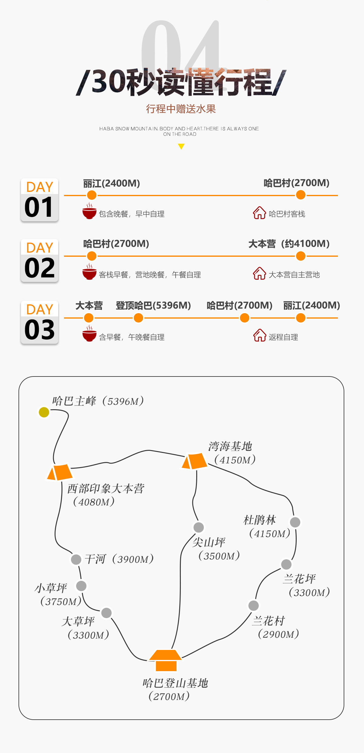 3、用餐:哈巴村早1个晚餐1个、大本营早晚餐各1个;